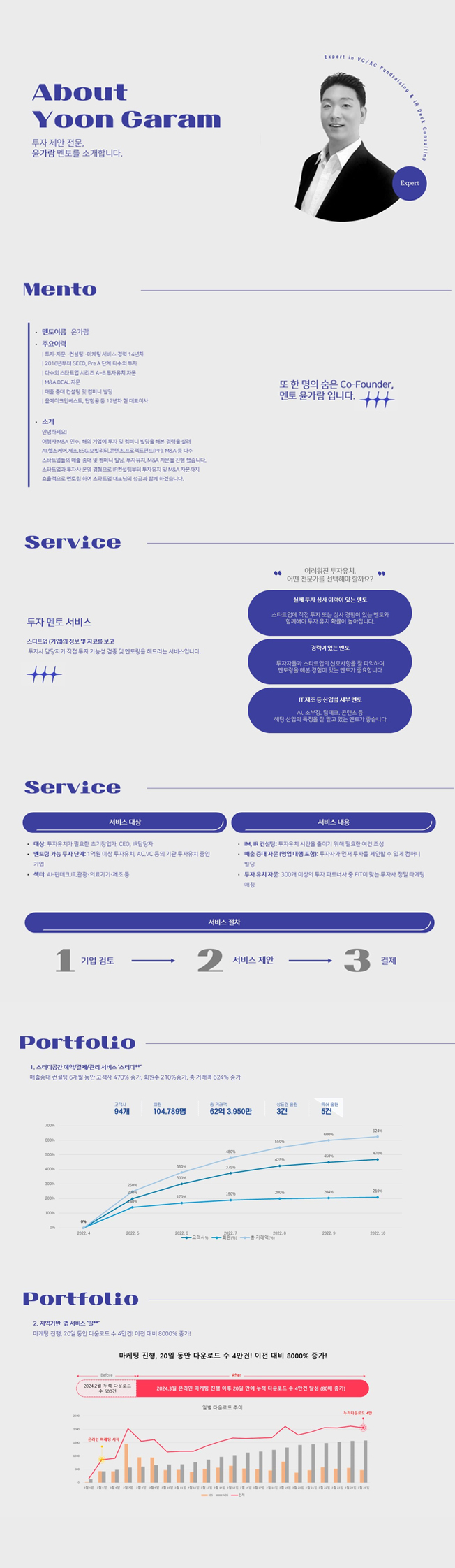 결제 → 기업 검토 (IR 또는 사업계획서 파일 공유) → 서비스 제안 (기업에 맞는 서비스 제안)
